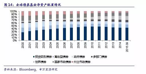 第二,在各类债券基金中,信用级别较高、违约风险较小的投资级别债券所吸收的资金量最大,且在2000-2011年之间保持持续上升趋势,随后虽出现小幅回落,但并不影响其绝对主导地位。