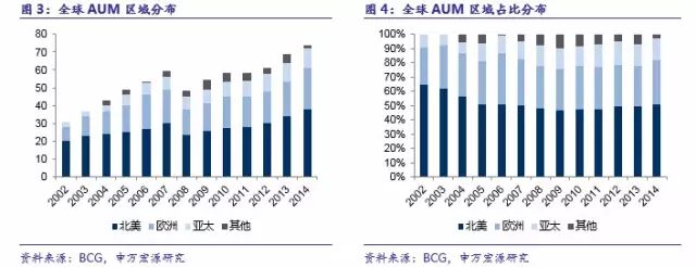 传统资产管理主导地位虽难改,但另类资产管理日受青睐。长期以来,传统资产管理(包括共同基金、养老基金和保险基金)AUM占比始终超过80%;但另类资产管理(包括对冲基金、私募股权基金、主权财富基金和交易所交易基金)AUM占比已由2002年的6%涨至近20%,这主要是由次贷危机后投资者风险偏好发生了较大变化,资产管理产品变得越来越复杂,创新趋势明显所致。