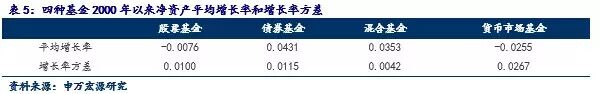第一,债券基金已于2011年开始取代货币市场基金,成为全球净资产规模占比仅次于股票基金的资产管理产品种类。另外,从发展趋势和稳定性来看,债券基金的整体表现应该是最好的。结合表5,从净资产平均增长率看,债券基金最高,为0.0431,而股票基金和货币市场基金均为负数;从增长率方差看,债券基金虽然高于混合基金,但明显低于货币市场基金,且股票基金相差无几。