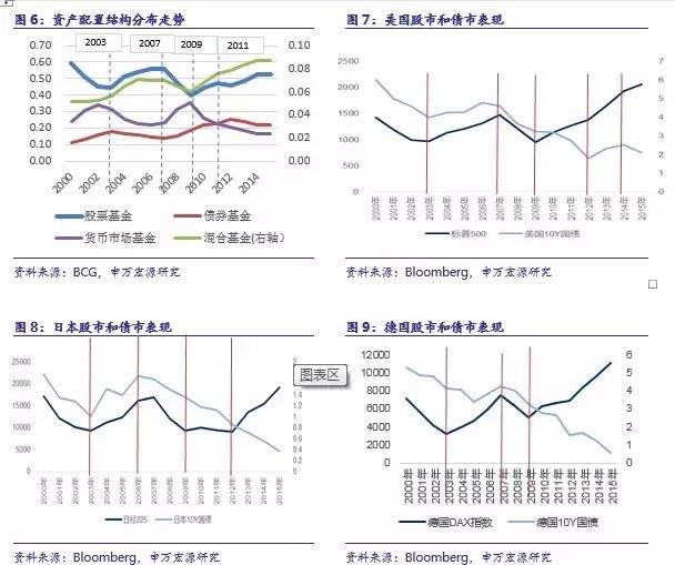 结合图6总结来看,在全球资产管理行业近十五年发展历程中,我们发现大类资产配置呈现如下特征及变化: