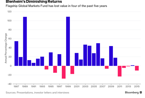 向养老基金提供咨询服务的NEPC LLC认为,Blenheim所存在的问题就是过早的执行一些策略。虽然这些策略许多最后被证明是正确的,但是在盈利之前就已经止损出局了。比如在大宗商品被大肆抛售的时候他们就尝试抄底,然而在真正触底反弹之后,他们却没能把握住那些强劲反弹的机会。NEPC认为,一旦Blenheim的资产管理规模低 于10亿美元的话,缅因大学养老基金就应该考虑撤资了。