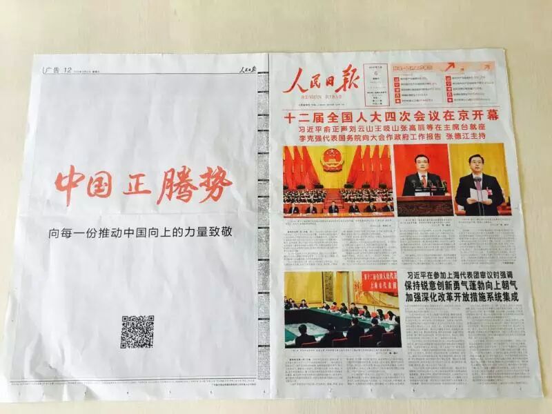 跨越风起云涌的“十二五”,中国与世界携手迎来发展的新起点。在3月5日这个特殊的夜晚,中国骄傲地现身于鸟巢巨型灯幕上,“中国正腾势”口号显霸气风范,不仅要告知全世界,中国经济正呈腾飞之势,我们对经济稳增长的信心,还要向每一份推动中国向上的力量致敬。次日,同步在《人民日报》呈现“中国正腾势”口号,正因为深知经济增速减缓、经济转型经历的阵痛,那些不畏挑战、奋进向上的力量更加令人鼓舞、催人奋进。