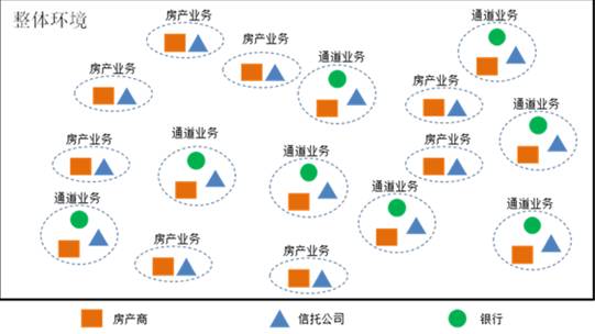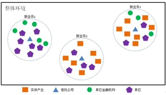在生态位理论框架下,我们分析了信托业传统业务的生态位构成。典型的通道业务生态位主要包括银行、地产商和信托公司三要素,三者更多是通过非正式社会关系建立连接,信托经理的人脉关系对于业务的开拓至关重要。而典型的地产类业务生态位主要包括地产商和信托公司两个要素,两者更多是通过区域性社会关系建立连接,项目成员借助信托公司的区域优势开展房地产项目。由于高度依赖非正式关系或区位优势,这些传统业务的“生态位宽度”较短,加之各家信托公司面临的外部环境极为相似,共同导致了信托业务的“趋同演化”。如图1所示,在我国,各家信托公司基于各自有限的资源开展通道、房产等传统业务,整体来看,这些传统业务之间呈现出点状分布特征,业务要素之间难以产生交集。