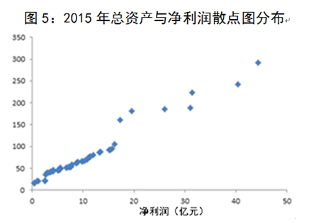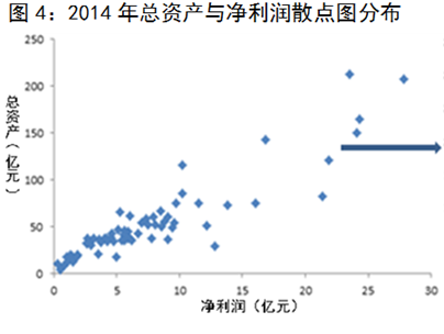 总资产和净利润散点图的变化最能反映出领先者的离散趋势。从图4和图5的总资产-净利润散点图的对比中可发现,与2014年比较,2015年领先者的散点更加离散,且向右上方移动,净利润和净资产增加明显。结合图3的集中度趋势来看,我们发现,规模的相对快速增长是领先者的共通之处,但在资产-净利润结构上(结构的不同反映了业务模式之间的差异),各领先企业并不趋同,说明各领先企业通过追寻各自差异化的转型目标,致力于创造差异化优势。