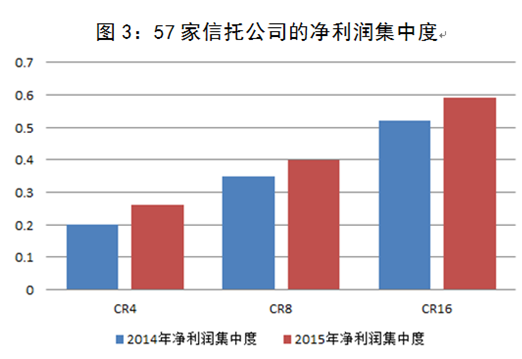 随着生态位的变迁,行业集中度进一步提升。从图3可以看出,以净利润为例,57家信托公司CR4(行业前四名份额集中度指标)、CR8(行业前八名份额集中度指标)和CR16(行业前十六名份额集中度指标)的净利润集中度分别从2014年的20%、35%和52%提升至2015年的26%、40%和59%。与此同时,跟随者步履维艰。从57家信托公司披露的财务数据看,不少2014年排名落后的中小型信托公司信托公司在行业转型的大背景下发展放缓,从总收入看,一些信托公司增长缓慢甚至出现严重的负增长,显示出在更加激烈的竞争环境下,跟随者并没有发挥其船小好调头的优势,反而在行业内外部的激烈角逐下成长乏力。集中度的提升反映的是生态位变迁的表象,深入分析发现,区别在于领先者和跟随着分别采取了不同方式来应对生态位变迁。