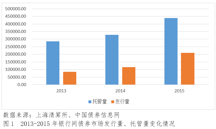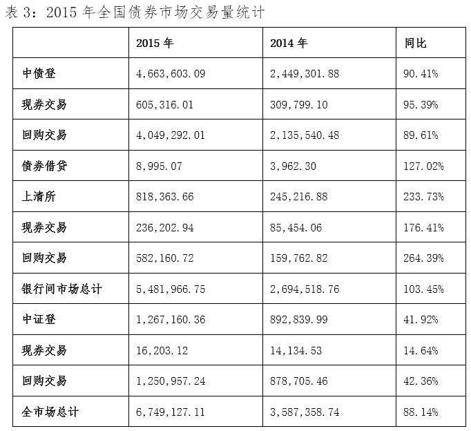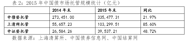 2015年,债券市场规模延续前年放量扩大的趋势,发行量和结算量增长近90%,托管量增长30%左右。
