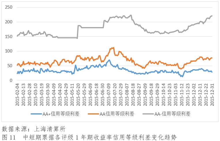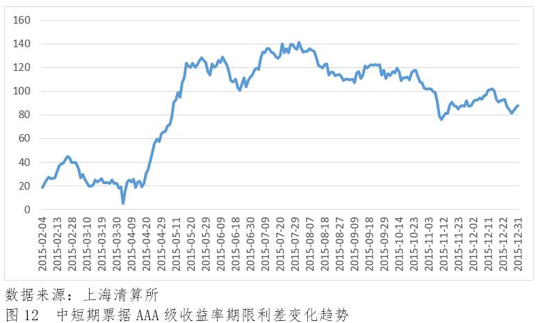 同时,2015年信用债发行利率整体呈下降趋势。除5年期AA+级中票外,3年和5年期各信用等级中票发行利率年末较年初均有所下降。AAA级、AA+级和AA级的3年期中票月平均发行利率年末较年初累计下降幅度分别达到约88BP、93BP和151BP。低信用等级品种发行利率全年波动较大。