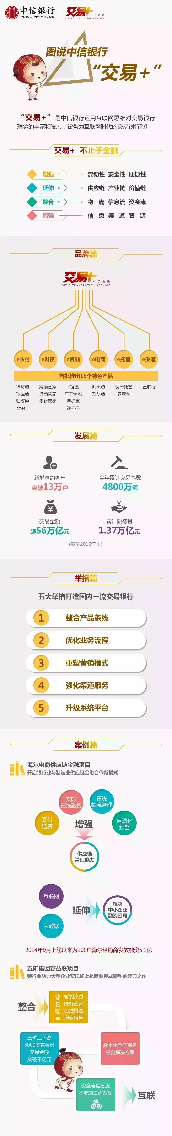 “交易+”从企业需求出发,立足满足企业多层次的需求,立足于专业化银行服务,延伸到大金融服务,扩展至跨界交易服务。在增强对企业财务服务的基础上,向企业的业务链条延伸,发挥中信集团各种资源整合的优势,为客户提供全流程、一站式、多渠道、智能化的综合金融服务方案。