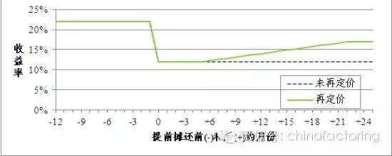 上表给出了一般情况下,受评证券要达到目标信用等级需要承受的收益率压力水平,在实际评级中还需要考虑一些定性因素,包括竞争情况、法律风险、资产池特性、发起机构再定价能力等对折损率的影响。竞争情况是一个关键因素,因为定价高的资产会受到降低利率维持市场份额的压力。法规风险之所以重要,是因为法规改变对信用卡收入产生方式有重大影响。资产池的特性也是影响折损率的重要因素,例如,与优质持卡人相比,次级信用卡持卡人的利率和其他相关费用相对要高并且更容易下降,因此对于次级持卡人占比较高的资产池就应当选用更高的折损率进行施压。发起机构的再定价能力同等重要,因为在市场利率上升的压力情景下,回收的财务费用会减少,如果发起机构能够根据信用卡应收账款的属性对其再定价[22],那么将减缓收益率的下降,因此在对收益率施加压力时,应当考虑发起机构对信用卡应收账款的再定价能力。如图 1所示,当资产组合的收益处于较大的压力环境,其收益急剧下降,但是由于利率的上升,发起机构会对资产组合进行再定价,因此其收益的下降会得到一定程度的缓解。当然,再定价影响还要取决于资产组合中固定利率和浮动利率两类资产在组合中的占比。