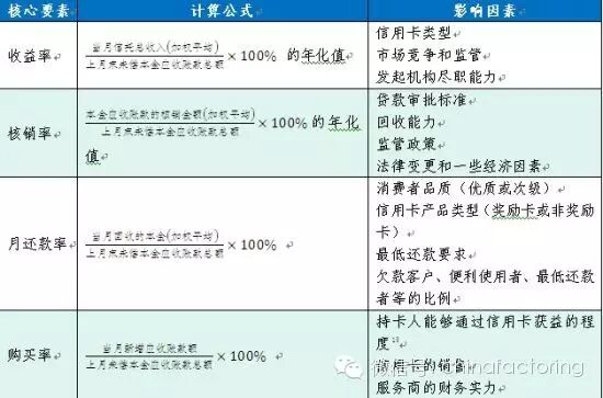 基础资产的表现是资产支持证券信用风险分析的基础,虽然影响信用卡应收账款信用表现的因素涉及经济、文化、法律、监管、竞争等多个方面,还受到发起人风险管理能力、贷款回收能力和客服质量的影响,但从国外评级机构在构建评级模型时重点考察的核心影响因素来看,主要是收益率、核销率、月还款率和购买率四个量化指标。