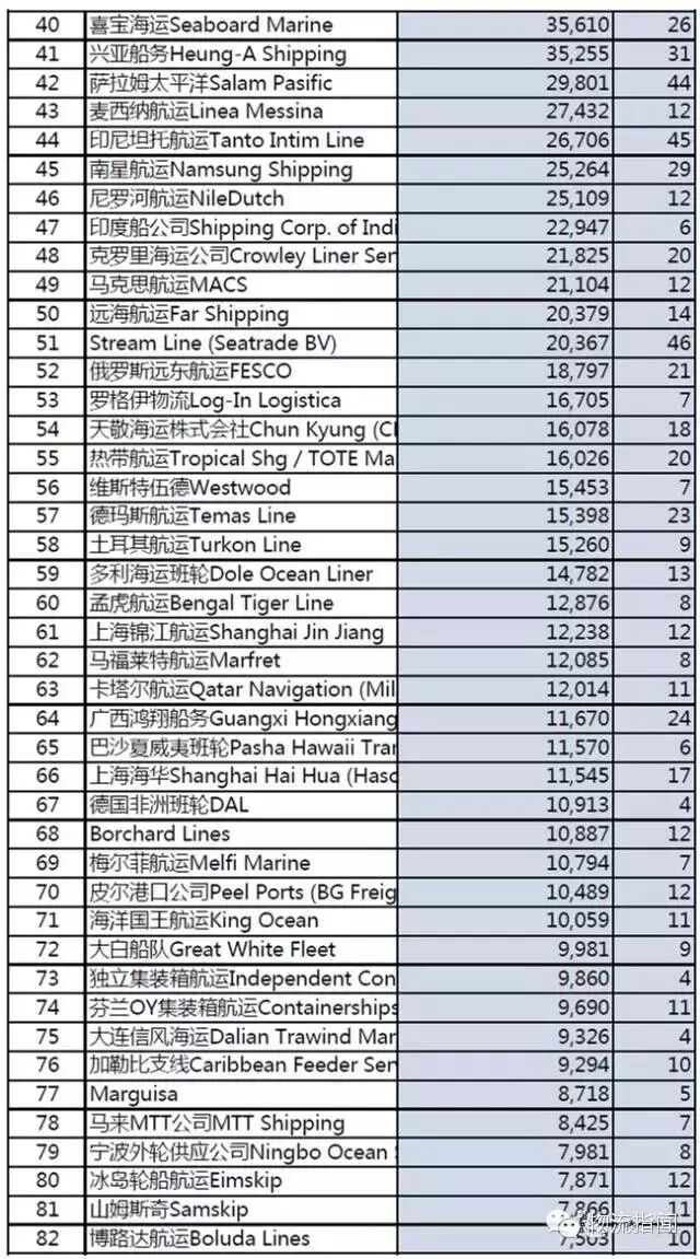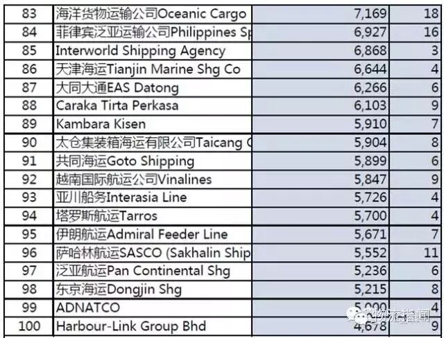 其中,第十一到二十位分别是:商船三井、美国总统轮船、阳明海运、日本邮船、现代商船、川崎汽船、以星航运、太平洋船务、万海航运、新加坡航运。