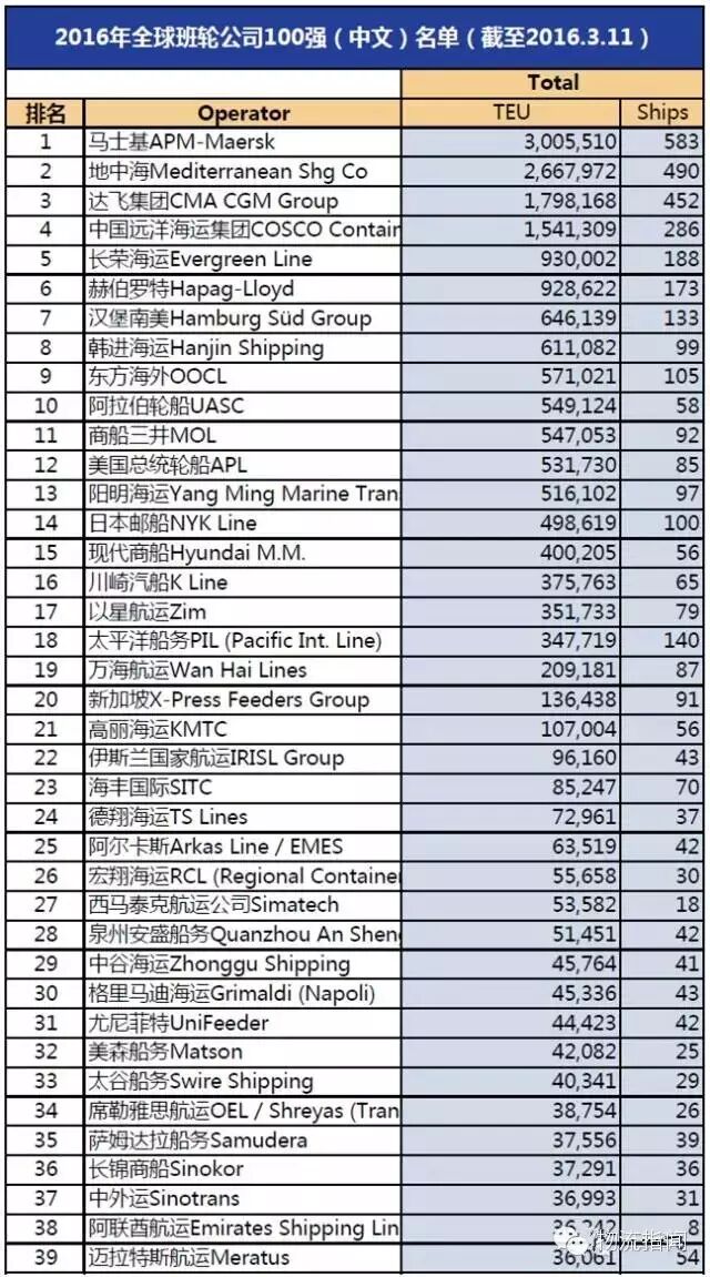 根据Alphaliner最新运力数据显示,截止至2016年3月11日,全球班轮公司运力100强中马士基航运排第一,地中海航运排第二,法国达飞轮船排第三。中国远洋海运(COSCO)首次以合并后的运力上榜,排名第四。