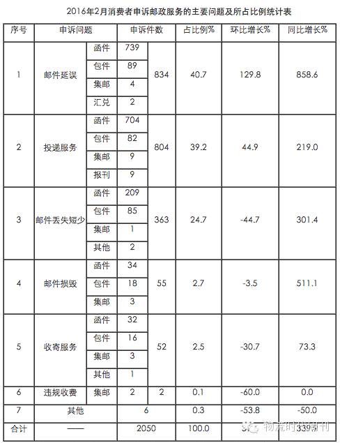 2016年2月,消费者关于邮政服务问题的有效申诉2050件,环比增长39.6%,同比增长339.9%。