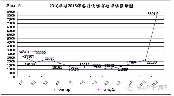 2016年2月,消费者关于快递服务的有效申诉33390件,环比下降2.7%,同比增长74.5%。
