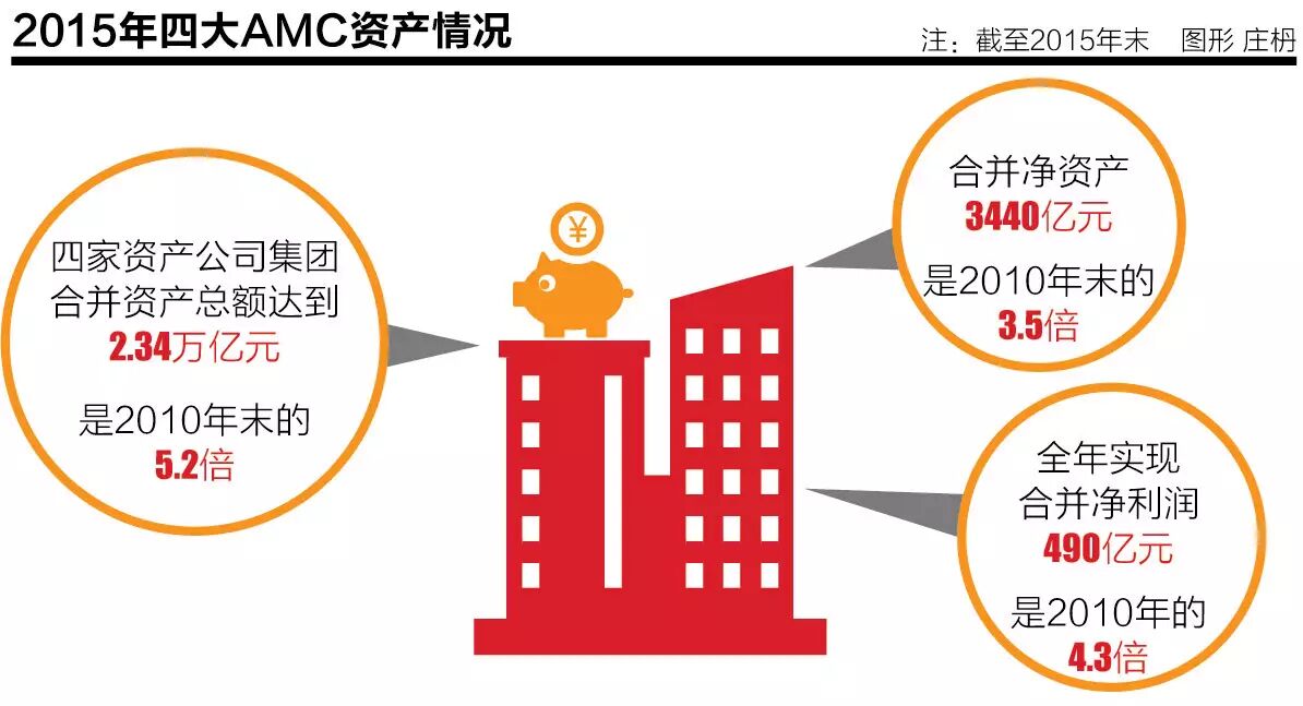 截至2015年末,四家资产公司集团合并资产总额达到2.34万亿元,是2010年末的5.2倍;集团合并净资产3440亿元,是2010年末的3.5倍;全年实现集团合并净利润490亿元,是2010年的4.3倍。