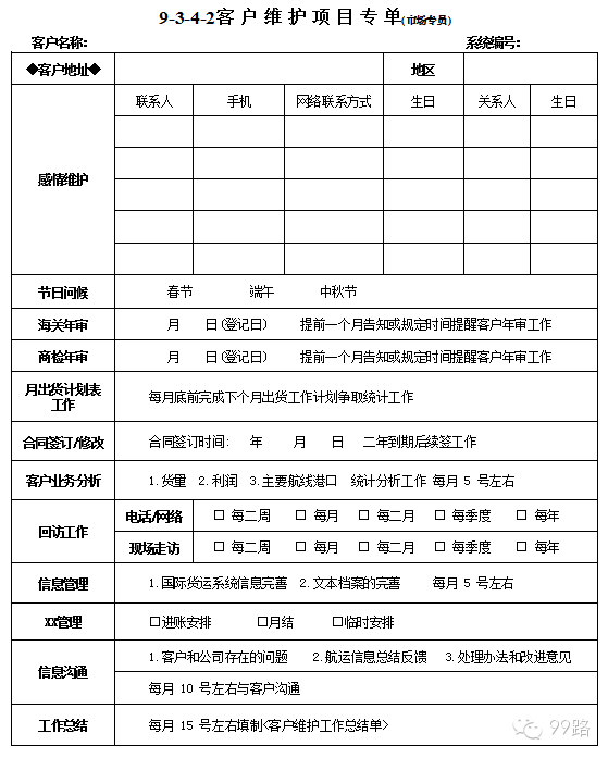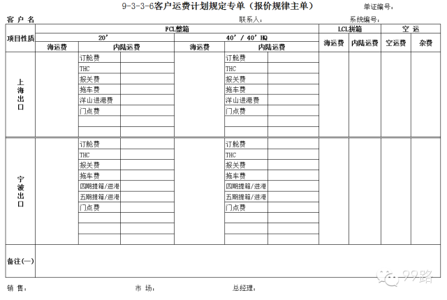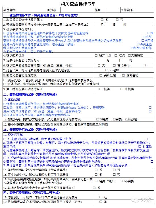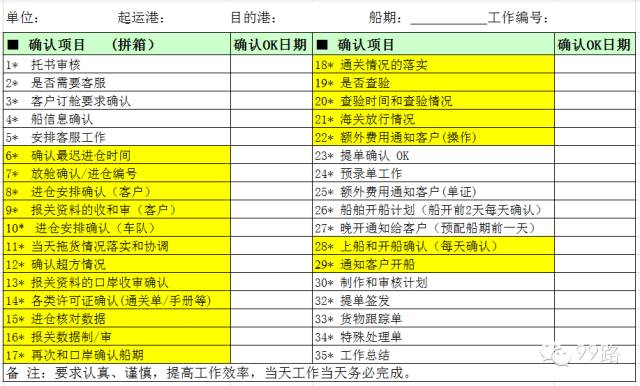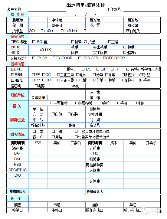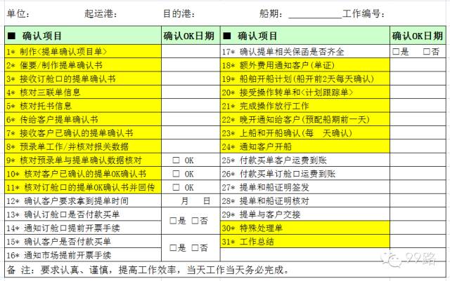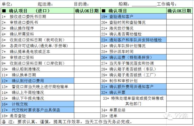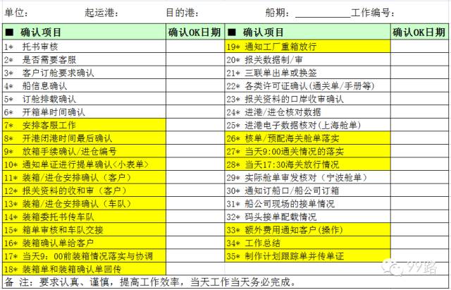 来源:99路 原创设计小九此类表单用于货代工作人员对业务流程关键点的监控,尤其对于货代新手,有一定的学习和参考价值。表格中有些流程需要根
