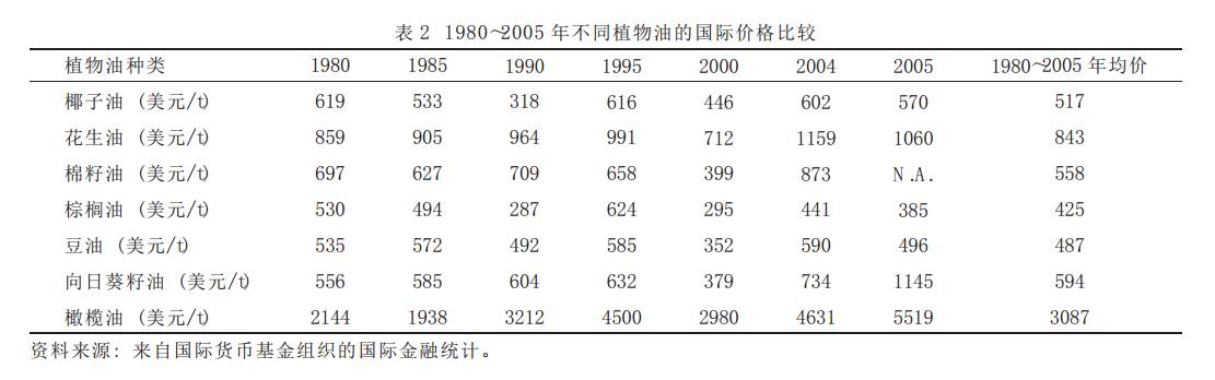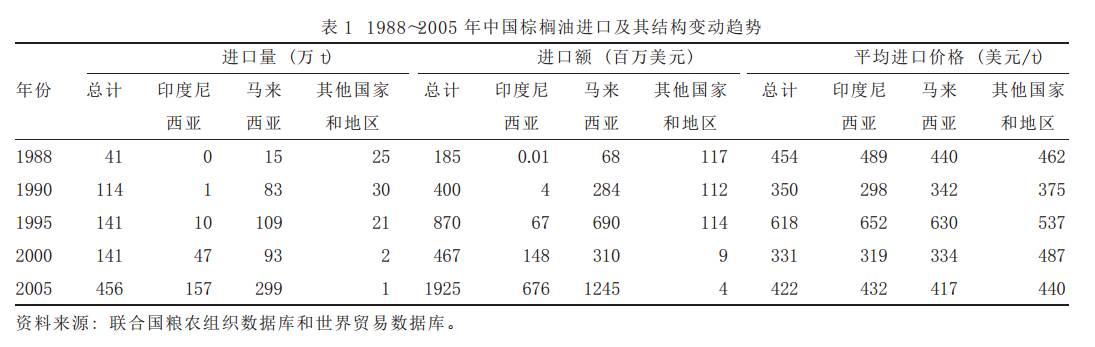 20世纪80年代末以来,中国棕榈油进口来源国的构成变动较大,1988年中国主要的棕榈油进口国家和地区分别为新加坡、马来西亚、奥地利、泰国和中国香港,到2005年中国进口棕榈油几乎就全部依赖于马来西亚和印度尼西亚。(见表1)在中国棕榈油进口中,来自印度尼西亚的棕榈油比重上升较快,2005年其比重已经达到34%,而马来西亚的比重则占到65%,这与其20世纪90年代的平均水平74%相比出现了一定程度的下降。中国来自印度尼西亚棕榈油的进口增加与印度尼西亚棕榈树种植面积的扩大以及低价有关,1990~2005年中国进口棕榈油中,每吨印度尼西亚和马来西亚的棕榈油平均价格分别为429美元和449美元,而且只有1995年、2004年和2005年前者的价格才高于后者。