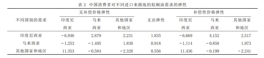 (1)中国消费者对来自棕榈油进口的需求的自价格弹性为负值且均大于1,特别是对来自印度尼西亚的棕榈油的自价格弹性值为6.946,表明中国消费者对进口棕榈油的需求富有价格弹性,对来自印度尼西亚的棕榈油价格特别敏感;