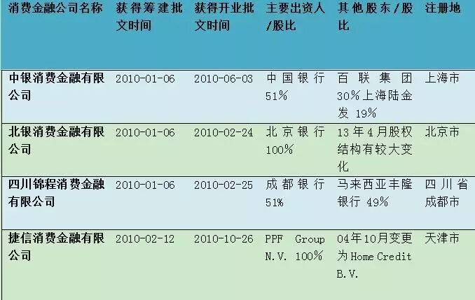 2009年7月银监会公布《消费金融公司试点管理办法》(以下简称《试点办法》),在北京、天津、上海、成都启动消费金融公司试点审批工作。2010年初,银监会相继批准了北银、中银、四川锦程和捷信四家消费金融公司。首批试点的消费金融公司中,除了捷信以外,其余三家均为银行系。