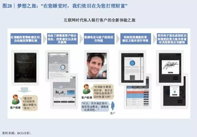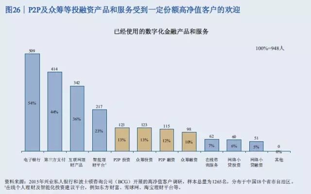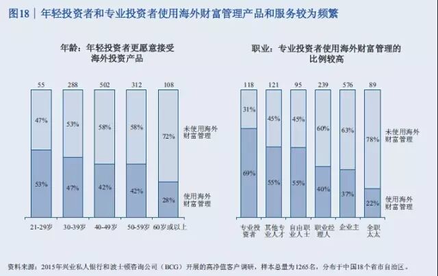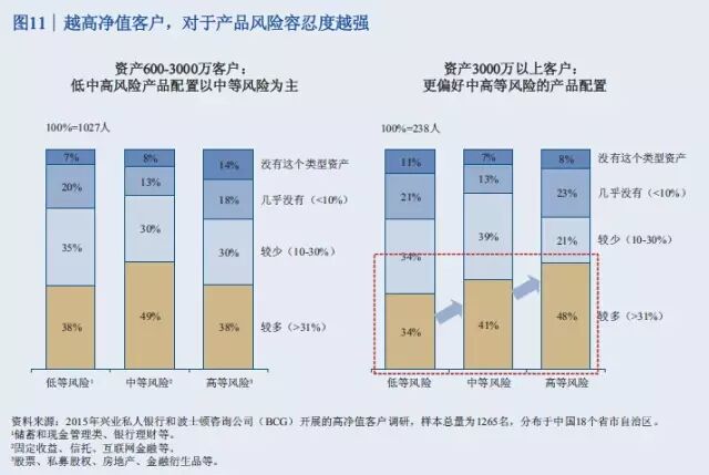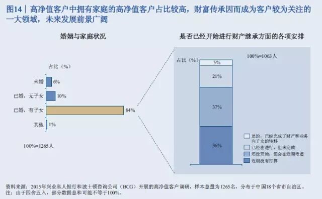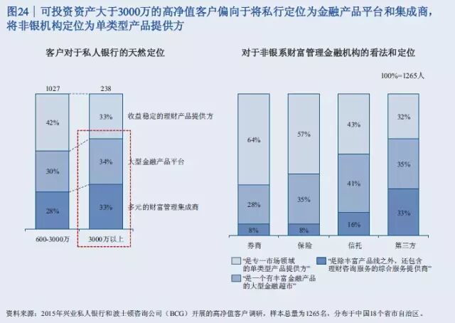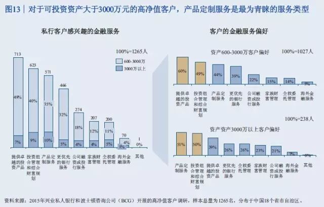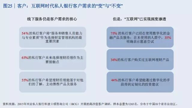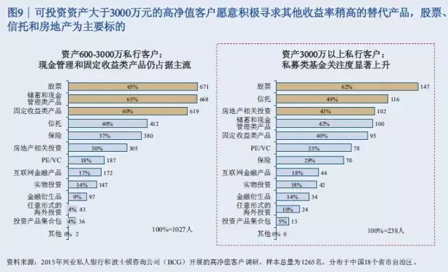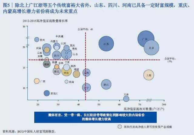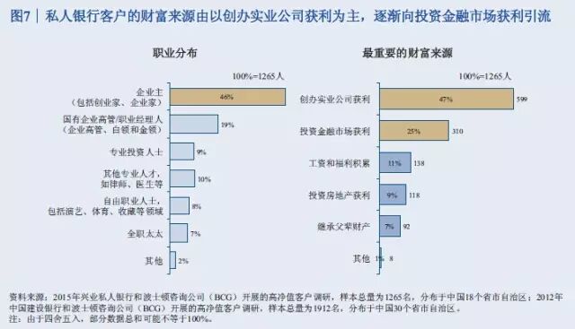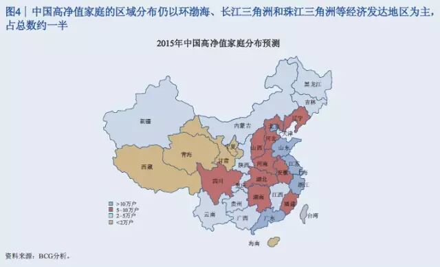 此次报告调查了中国18个盛世自助区的1265名高净值客户。调查显示,46%的高净值客户是企业主,19%是国有企业高管或职业经理人,9%是专业投资人士,10%是律师、医生等专业人才,自由职业人士包括演艺体育收藏界人士占比8%,全职太太7%。 47%的人最重要的财富来源是创办实业公司获利,25%的人靠投资金融市场获利,11%的人主要靠工资和福利性积累,9%的人主要靠房地产投资获利,7%的人靠继承父辈资产。 调查结果表明,私人银行客户的财富来源正在逐渐向投资金融市场获利引流。 从区域分布看,渤海湾、长三角、珠三角以前一直是中国富人最集中的区域,现在中部也在崛起。京广线上沿途的省份高净值客户增长速度比较快,长江经济带的四川、重庆、湖北、安徽等地也增长较快。 从省份上来讲,广东、北京、江苏继续保持比较快的增长率,而且存量客户较多。值得注意的是,山东、四川、河南这些省份规模相对较大,但增长速度也比较快。 数据显示,银行理财和资本市场将是2015年个人投资重点,储蓄占比将进一步下滑。2015年,居民储蓄占比从2013年的64.1下降到51%左右,银行的理财、股票、基金、债券等等都保持比较高速的发展。 以下为《中国私人银行2015》报告中的34张核心图解 伴随着中国经济进入新常态,未来五年整体私人财富增速将趋缓,但总体规模巨大 2013至2015年中国高净值家庭数量快速增长,但在未来五年将保持中速增长 银行理财和资本市场等金融产品将是2015年个人投资重点,储蓄占比将进一步下滑 中国高净值家庭的区域分布仍以环渤海、长江三角洲和珠江三角洲等经济发达地区为主,占总数约一半 除北上广浙江等五个传统富裕大省外,山东、四川、河南已具备一定财富规模,重庆、内蒙高增长潜力省份将成为未来重点 全球领先银行集团的财富管理/私人银行业务均呈现出收益稳定、贡献逐年上升等特点 私人银行客户的财富来源均由创办实业公司获利为主,逐渐向投资金融市场获利引流 私人银行客户的投资领域由现金管理类、固定收益类产品转向二级市场、现金管理类、信托、PE/VC等多元拓展 可投资资产大于3000万元的高净值客户愿意积极寻求其他高收益率稍高的替代产品,股票、信托和房地产为主要标的 股票、信托、固收和现金管理类等领域的关注度较高,私募类基金将可为近期新兴热点 越高净值客户,对于产品风险容忍度越强 投资者逐渐转向更为激进的投资理念 对于可投资资产大于3000万元的高净值客户,产品定制服务是最为青睐的服务类型 高净值客户中拥有家庭的高净值客户占比较高,财富传承因而成为客户较为关注的一大领域,未来发展前景广阔 子女家庭分配和生活教育水平也是私人银行客户最为关注的话题 家族财富领域在初期发展阶段,国内客户对于该类服务的特点及内涵理解程度尚浅,但了解意愿强烈 私人银行客户对于投资领域的多元化需求推动了海外财富管理服务的发展,资本市场化成为大势所趋 年轻投资者和专业投资者使用海外财富管理产品和服务较为频繁 资产的安全私密、增值及对冲国内风险是私人银行客户投资海外的主要原因 未来,对于孩子投资产品品类的关注度仍将持续在股票、金融衍生品和房地产领域 服务方面,境外资产配置建议和法律服务是最受关注的海外财富管理服务 超过80%的中国私人银行客户的海外资产集中在美国、香港和加拿大 美国市场上主要有四大渠道向高净值客户提供服务 可投资资产大于3000万的高净值客户偏向于将私人银行定位为金融产品平台和集成商,将非银机构定位为单类型产品提供方 客户:互联网时代私人银行客户需求的变与不变 P2P及众筹等投融资产品和服务受到一定份额高净值客户的欢迎 定制化的投资建议和在线交易是客户最感兴趣的互联网化服务 梦想之旅:在您睡觉时,我们依旧在为您打理财富 技术:成就互联网时代私人银行客户的梦想之旅 面向2020,借力互联网实现私人银行也的改良和改革 瑞士信贷:端到端的移动私人银行服务平台 变革:金融科技正在解构私人银行价值链,放开架构、降低门槛 转型与发展并行中的私人银行业正在经历文化的膨胀与融合 制胜于互联网时代,私人银行需要注重打造五大适应型优势