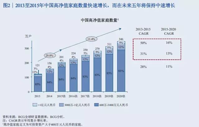 兴业银行携手波士顿咨询公司(BCG)联合发布中国私人银行全面发展报告《中国私人银行2015:千帆竞渡 御风而行》。报告指出, 2015年中国私人财富将达到人民币110万亿元,高净值家庭数量达到201万户,拥有约41%的私人财富。到2020年,高净值家庭(可投资资产超过 600万元人民币)数量将以11%的年增长率增长至346万户,这为私人银行业务的发展提供了良好的机遇。