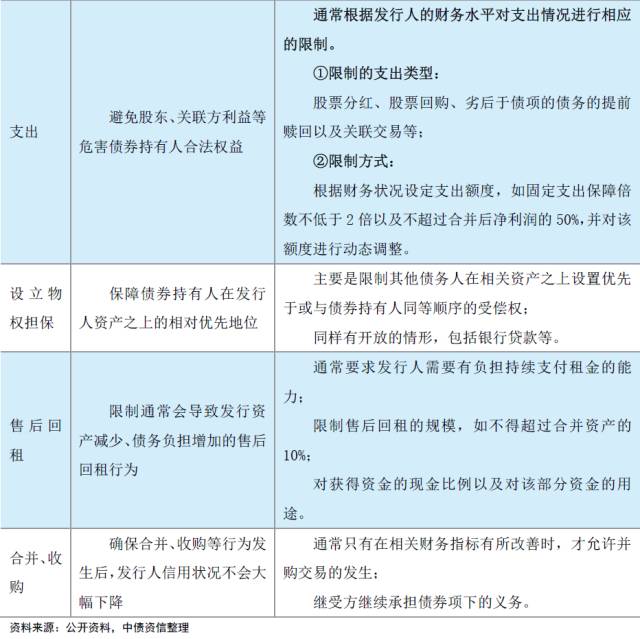 其他常用的还有增设权利负担限制条款、售后回租限制条款以及合并限制条款等。增设权利负担限制条款主要是限制其他债务人在相关资产之上设置优先于或与债券持有人同等顺序的受偿权,同样有开放的情形,包括银行贷款等。售后回租限制条款,售后回租交易通常发生在企业有提高资金流动性的需求之时,由于售后回租与担保融资较为相似,通过卖出资产获得的收益类似于从银行获得的贷款,支付的租赁费类似于还款,所以该类限制条款通常要求发行人需要有负担持续支付租金的能力。同时售后回租因涉及资产出售事项,所以对其中的出售资产环节有资产出售条款限制中的类似要求,如对获得资金的现金比例以及对该部分资金的用途均参考其要求。保护程度较高的条款会将售后回租的规模限制在合并资产的10%以内。不过,当该交易的时间少于3年时,则通常不受到上述限制。合并限制条款主要是确保合并发生后,继受方继续承担债券项下的义务。通常只有在相关财务指标(如固定支出保障倍数)有所改善时,才允许并购交易的发生。