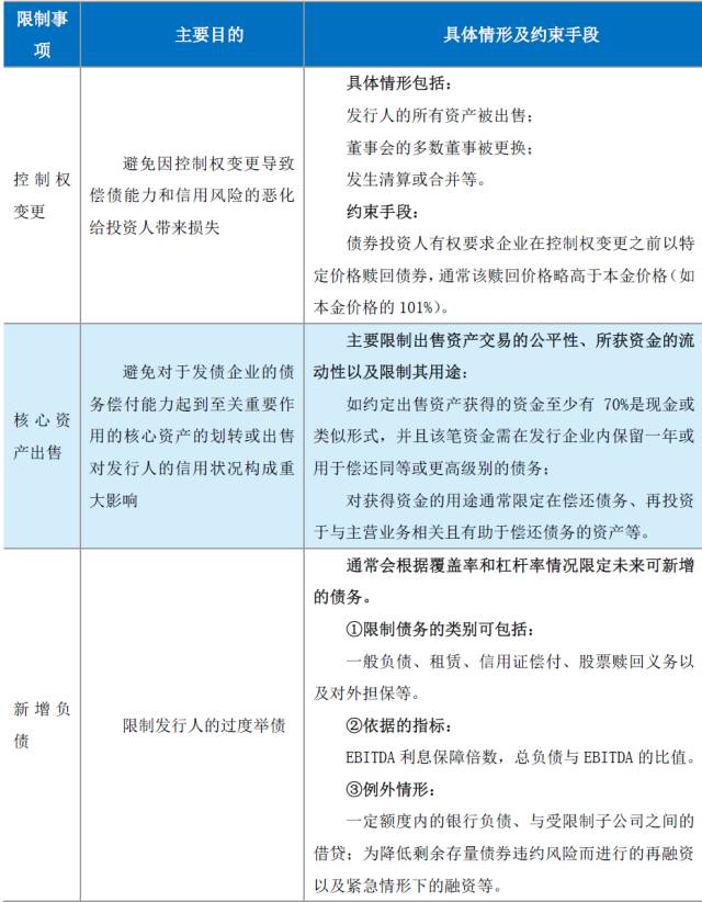 保障条款主要是为了控制交易对方的风险水平,对交易对方后续的经营、投资、财务行为等进行的一些约束。该类条款在银行贷款协议、企业并购文件以及其他一般商事文件中已广泛应用。以银行贷款协议为例,对于短期无担保贷款,银行设置主要的保障机制之一是保持负债企业资产的流动性,能用于临时性用途;对长期贷款,银行可能要求借款人的资产负债率、毛利率等指标需维持在某一水平。在债券合同中约定该类条款的目的同样是使得发行人在债券存续期尽量维持发债之时的信用风险水平,因此发债文件中的保障条款主要是对发债企业后续的投融资以及重大财务行为等进行控制和约束,如常见的控制权变更、核心资产划转、并购重组等行为。