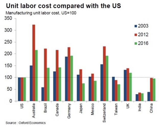 当我们还在担心收入更低的国家抢走工作机会的时候,却惊奇地发现,中国制造业的单位劳动力成本已经超过了日本、墨西哥,直逼美国。