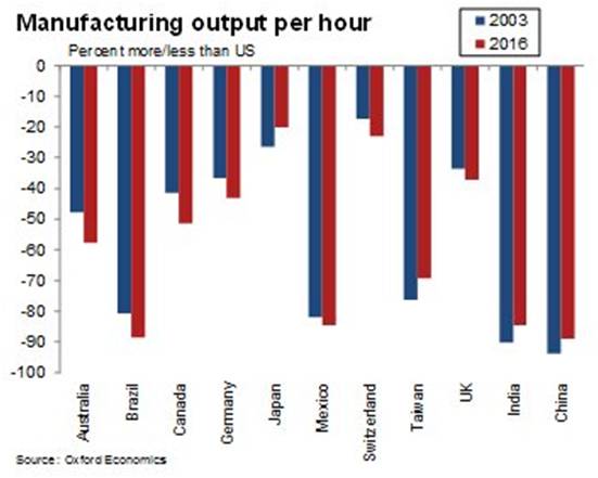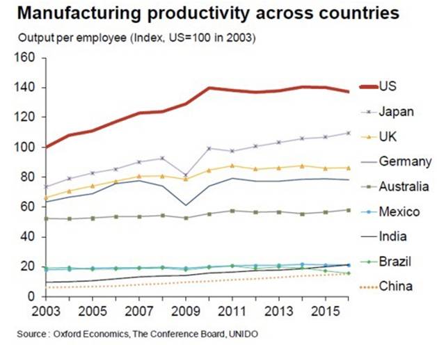 我们谈的单位劳动力成本并不仅仅指工资水平,而是单位产出所要付出的劳动力成本。与单位劳动力成本相关的除了工资还有劳动生产率。根据牛津经济研究院(Oxford Economics)、美国大企业联合会(The Conference Board)和联合国工业发展组织(UNIDO)的数据,尽管中国在2003年至2016年间的劳动生产率增速超过美国,但从绝对值而言仍大大落后。当前中国制造业劳动力生产率比美国低接近90%,落后于印度和墨西哥,与巴西接近,后者的劳动生产率在过去的几年中一直在下滑。