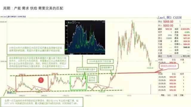 这个是国际市场上的铜价,也是我最早研究的领域,一个时代性的格局,大概在这个地方,事件大家都清楚,我们国土事件,看到前面的区间,大家会认为铜价就是一千五到三千,但是当时发生了一个巨大的变量,中国的需求增加,为什么大家没有把握这一点呢?还要用常态思维考虑呢?因为前面30年大家讲的不是需求,前面30年没有中国新增变量,全球的经济处于一个混沌状态的,日本的经济增速以后没有太亮丽的需求变化,这个过程中价格的上涨只有两个变量,第一供给的收缩,第二,人为造成的供给的收缩。大家可以想想日本的铜先生(音),可以想想现在的格兰波(音),这个叫认为造成的供给紧张,比如上面放的一个图,这个是当时我们说日本的铜先生做盘,硬是造成人为的紧张,但是没有造成绝对的价格趋势。之前的价格是什么样的?卖空,然后大家开始慢慢的消化产能,消化投资,要经历很长的一段时间内,使供应的问题解决之后,大家的价格再重新来一次,直到中国出现。有人在这个转折点一定要犯错误,每一个点都有巨头死掉或者倒霉。你会发现铜价会大跌,跟工序没有关系,引起流动性的收缩,金融资本和流动性的收缩下,那个时候所有的资产价格短期流动性被冻结,所以那段行情并不具有参考意义,真正的周期结束就是两段,中国真实的需求,中国虚假的需求,结束以后大家开始慢慢的消化。同样结束的时候先是中国虚假需求的破裂,就是人民币不升值了游戏就第一段结束了,大家就会发现前期给中国还在产出的货,大家开始慢慢吸收,如果有巨头在拖盘价格会低的慢一些,如果没有拖盘价格会跌的快。铜为什么跌的不是那么流畅?因为中间拖盘的巨头没有死。有些产业链更巨大,因为中间产业链的结构不一样,比如说螺纹铁矿,中间的贸易商已经干死了,没有人了,就是中间巨大需求的蓄水池小时掉了,有人会讲到整个产业链库存很低,会进入个补库的状态,因为你高估了这个状态,你还在讲需求,不会再回来了。但是有些小品种的行业,现在反倒还有巨型的贸易商,你发现它的价格波动不是一路顺畅了,中间会有一波三折,这就是每个产业链结构。大家还是要细化来看,理论上来讲打到出七,打到供给端收缩,供给端的破产倒闭重组,这是大宗商品每一轮在这个周期过程中产生的事件性的东西,而且一定会打穿成本。不到成本之下,你指望它自己主动停产减产不可能。你要依据这个东西提前的预制和预判,什么样的商品会率先的走出来,什么样的商品会滞后的走出来。在为的几年商品的配置可不是绝对性的东西,什么意思?有的是可以做多的,有的是一定要做空头配置的,如果按照股票的操作思路,轮着买那你只能给别人创造更好的机会,这不是像股票的大类综合的配置,商品毕竟有实货对应着,股票是虚的东西,没有实货对应。这里面有很大差异性的东西在里面。
