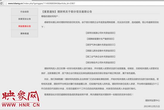 来源: 第一财经日报理财邦官方网站挂出的项目逾期公告近日,理财邦被曝出现兑现危机。自2015年12月21日起,投资者们应得的投资利息及本金迟迟无法