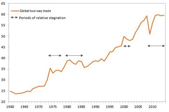 过去几年的数据显示我们正陷入所谓的“贸易停滞期”,即全球双边贸易总量占GDP的比重始终停滞不前,而之前五十多年中大部分时候全球贸易增速都要高于GDP增速。