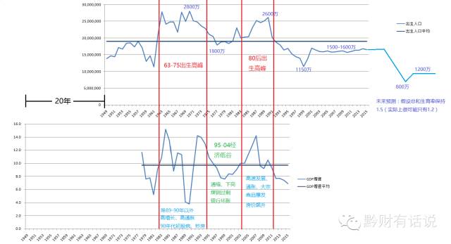 第一次人口高峰:建国后第一个人口出生高峰出现在三年困难时期后,直到70年代中期为止,平均每年出生2500万人,最高峰在1970年达到2800余万。这一高峰时期的人口在80年代中期至90年代中期进入20岁。在这10年里,除89-90年外,其余年份中国经济均保持高速增长,且出现了较高的通货膨胀。90年代初期出现了股疯和第一次炒房热。