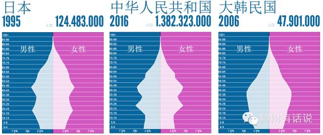 2016年中国、1995年日本、2006年韩国人口年龄结构对比