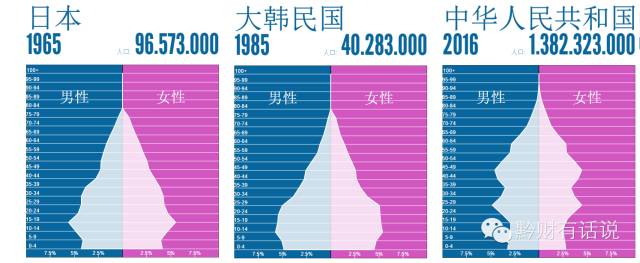 这一时期,日韩两国的人口金字塔如下图所示,和现在的中国相比,无疑是非常年轻的。