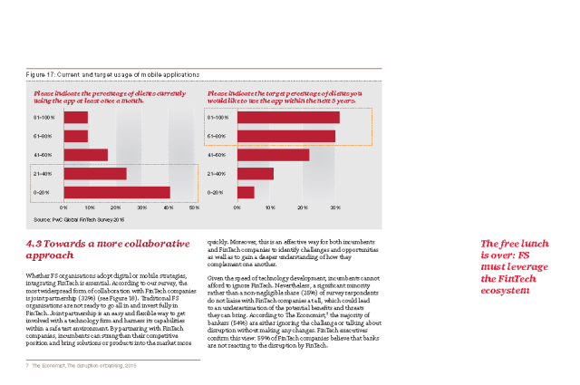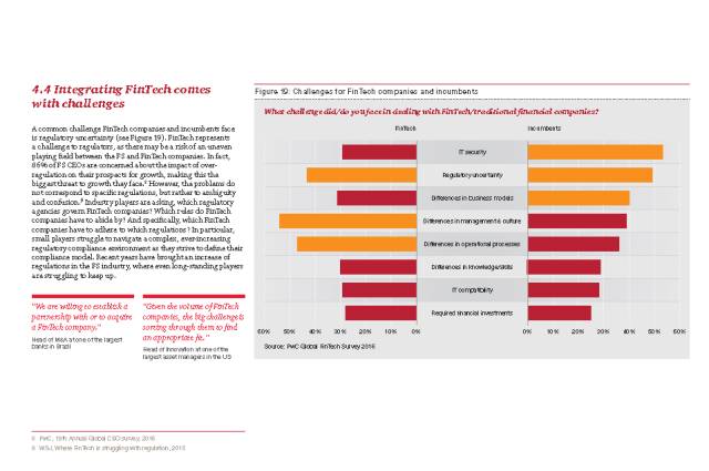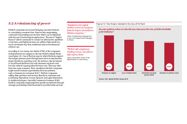 最近,一份新出炉的普华永道的报告中显示,83%的金融服务公司认为他们商业中的某些特定方面正处于众多金融科技创业公司带来的创新冲击中,95%的银行业管理层专业人士都在担忧这个问题。