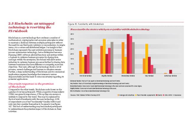 “83%的受访者都处于‘适度’了解的水平上,而只有极少数受访者表示他们是这方面的专家。这种了解度的匮乏可能导致市场参与者低估区块链对其活动所产生的潜在影响力。”