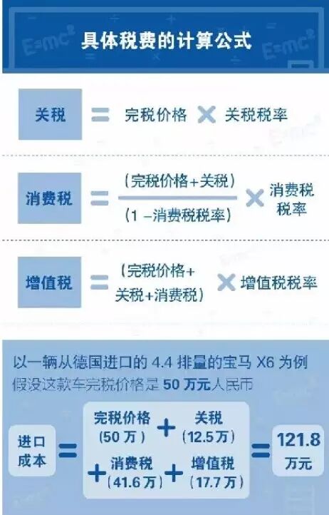 微博还以德国进口的4.4排量的宝马X6为例计算了税费。假设这款车的完税价格是50万元人民币,经过计算,它需要交纳12.5万的关税,41.6万的消费税以及17.7万的增值税,最终这辆车的进口成本是121.8万元。