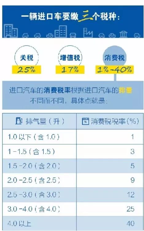 海关总署官微近日发布微博称,其实进口汽车那么贵,还真不完全因为关税高。海关总署发布的数据图显示,购买一辆进口汽车要缴纳3个税种,包括25%的关税,17%的增值税以及区间在1%—40%之间的消费税。其中消费税率根据汽车的排量不同而不同,排量越大,消费税税率越高。具体的税费是:(关税+消费税+增值税)的总和。