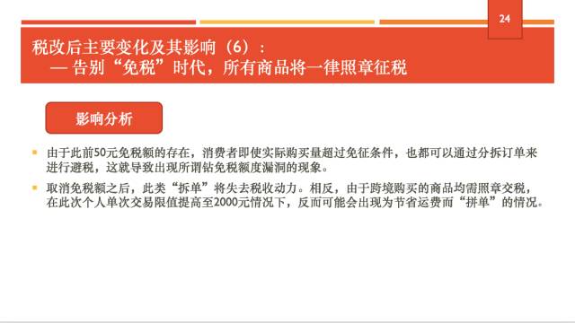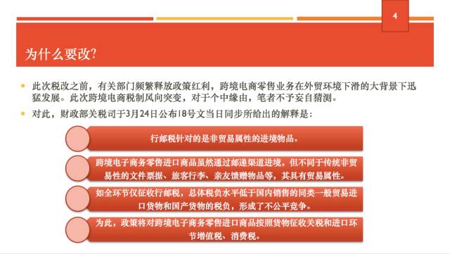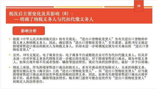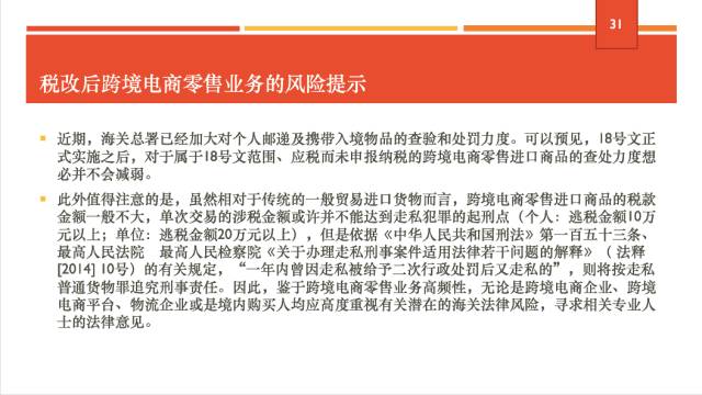 此次跨境电商零售进口商品税改是在怎样的大背景下启动的?此前针对跨境电商零售进口商品试行的行邮税试点为何风云突变?此次跨境电商零售进口商品税改主要内容有哪些?税改前后的主要变化有什么?税改对于跨境电商零售行业有关各方的影响有多大?税收新政推出之后,跨境电商零售行业应注意哪些法律风险?