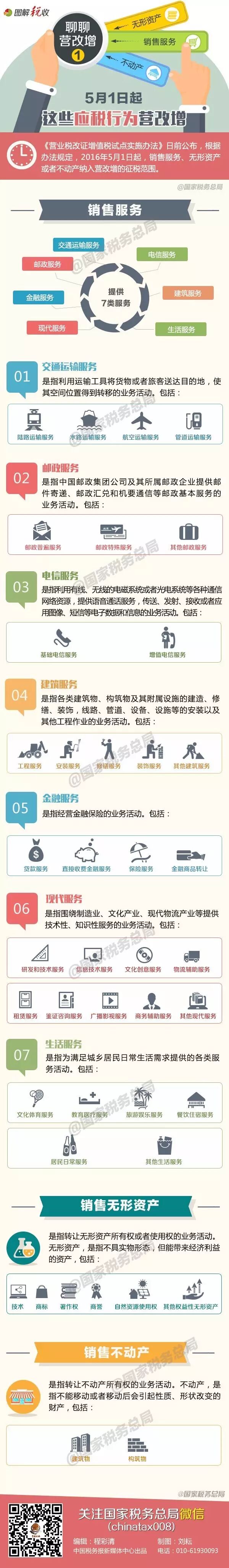 《营业税改证增值税试点实施办法》日前公布,办法规定,2016年5月1日起,销售服务、无形资产或者不动产纳入营改增的征税范围。具体包括哪些应税行为,戳图了解↓