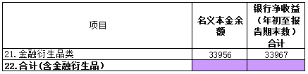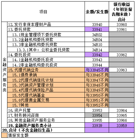 [15.5代理代销基金] 指填报机构通过其营业网点和电子银行系统接受投资人基金认购、申购等交易申请的业务,含基金专户,不含资产管理计划。本项目填报报告期内当期发生金额。与银行签订相关代销协议的私募基金均应该计入。[15.6代理贵金属交易] 指填报机构通过营业网点或电子银行系统等所有渠道为个人及法人客户办理的贵金属账户、现货、递延、代理销售和回购等业务。本项目填报报告期内当期发生金额,填报币种为本外币折人民币。[15.7其他] 本项目反映报告期内填报机构代理销售除基金(含基金专户和资产管理计划)、保险、信托计划、贵金属之外金融产品的发生金额。分支机构行代销上级行发行的非保本理财产品在该项填报发生额。法人机构在填报本表时,只反映代理代销非本行金融产品的情况,按发生额填报,分行代销总行产品不在表内反映。今后报表修订会增加细项,反映各填报机构具体代理代销非保本理财的余额。[16.资产托管] 是商业银行根据合同或协议约定,履行安全保管资产、资金清算、核算估值、投资监督及信息披露等职责,并提供与投资管理相关服务的业务。本项目填报期末余额。[17.财务顾问咨询] 本项目反映填报机构作为客户财务顾问,在切实分析客户实际需求的基础上,灵活运用各种金融知识、金融信息、金融工具、金融渠道和金融资源等,为客户提供有实质性服务内容和个性化特点的顾问服务及金融产品时所获得的收入。本项不填报余额或发生额。[18.其他金融资产服务业务] 反映填报机构除12-17项外其他金融资产服务业务的金额。特别提示:若本项/[19.金融资产服务类小计]>=5%,则须将本项涉及主要业务内容相关材料同步提交至银监会。人民银行是“其他金融资产服务业务/(发行表外理财产品+委托贷款+委托投资+资产托管) >=5%”,须将本项目涉及主要业务内容相关材料报送至人民银行调查统计司。很显然如果有金额较大的金融资产服务业务,今后报表会将其列入统计项。金融衍生品类指价值取决于一种或多种基础资产或指数的金融合约,合约的基本种类包括远期、期货、掉期(互换)和期权等。衍生产品还包括具有远期、期货、掉期(互换)和期权中一种或多种特征的结构化金融工具。此项目填报名义本金期末余额。此项以名义本金期末余额填报。根据金融衍生品的性质,笔者认为收益应填报净收益(可能会亏损),如果只反映银行端收入,比如利率掉期业务,只反映利息收入,不轧差利息支出,统计意义不大。与人行指标代码对照关系具体如下。