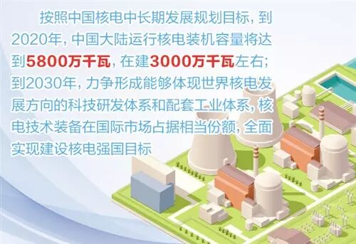 中国政府于2012年发布了调整的《核电中长期发展规划(2011-2020)》,明确提出了2020年实现运行核电装机5800万千瓦、在建3000万千瓦的目标。中国将在确保安全的基础上,积极推进核能发展。