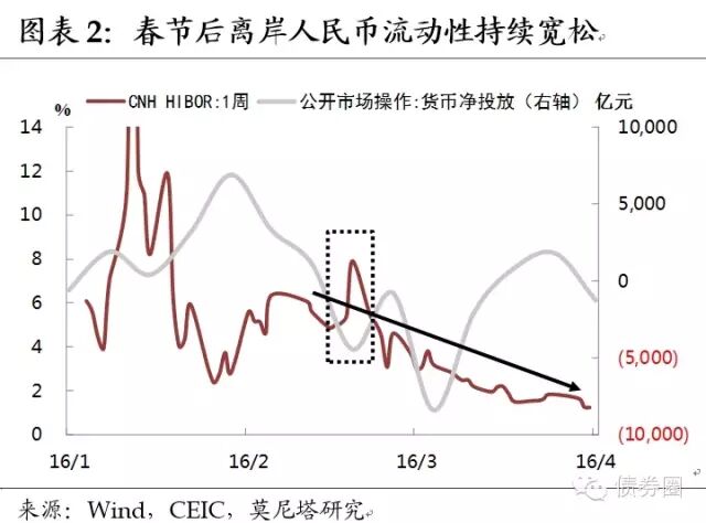 一方面,离岸市场空头撤退,导致CNH拆借需求大为减弱。证据在于:首先,春节后随着人民币汇率走稳,CNH汇率向CNY汇率回归(图表1),显示离岸市场空头渐趋沉寂;其次,CNH拆借利率几乎持续下行(图表2),显示离岸人民币流动性非常宽松,进一步证明由做空人民币导致的流动性占用大为减弱。期间仅2月18和19两日,7天拆借利率出现了大幅上行,主要原因是当时央行公开市场操作持续净回笼,导致可流入离岸市场的流动性明显减少。20日以后,随着公开市场净回笼量的减少,CNH拆借利率便迅即回到了下行通道。