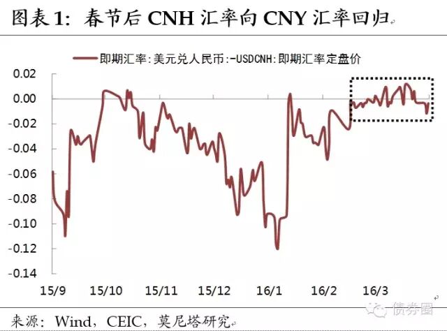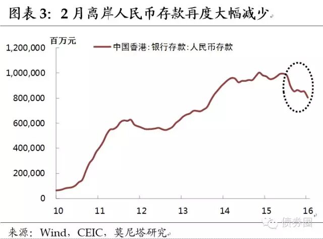 另一方面,2月香港人民币存款大幅减少,显示人民币资产在离岸市场的吸引力进一步降低(图3)。香港人民币存款的减少是从去年8月开始的,8月-10月其间降幅非常明显,原因在于去年“8-11”汇改导致人民币贬值预期浓厚,套利盘大幅出清人民币资产。今年2月香港人民币存款再度大幅减少,很大程度上与1月央行急剧抽紧离岸人民币流动性有关。央行在成功击退空头的同时,也对离岸市场持有人民币的热情造成了重大打击。这也是市场一直指责的,央行此番维稳汇率会阻碍人民币国际化的进程。但我们需要辩证地看待这一问题,只有短期确保人民币汇率不出大的问题,人民币国际化才能在长期内走得更加顺畅,二者并不存在根本的矛盾和冲突。