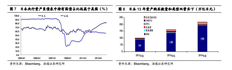 近十年来,日本央行量化宽松基本都是以大规模购买本国国债的方式实现的。 2009年和 10 年的量化宽松, 2013 年的“ QQE”也是以购买国债为主。日本央行货币政策依赖于对国债购买的逻辑在于: 第一, 传统货币工具已经接近失灵,边际效应已经大幅递减;第二,日本国债市场容量巨大。截止 14 年 6 月底,日本国债余额接近 870 万亿日元;第三,日本财政赤字扩大,央行需要大量买入国债以压低融资成本。