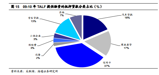为了激活信贷市场,降低消费和企业融资成本,美联储和财政部合作在 08 年 11 月共同推出了定期资产支持证券贷款工具( TALF),向以 AAA 级 ABS 作为抵押的机构提供至多 5 年期的定期贷款。 AAA 级 ABS 的抵押资产包括汽车贷款、小微企业担保贷款、信用卡贷款、学生贷款等。 TALF 工具的推出意在保障作为 ABS 资产池的个人消费和小微企业贷款的流动性,从而防止消费和投资的下滑。