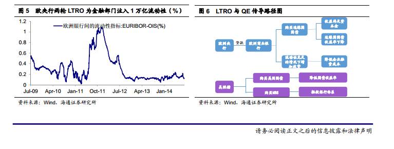 对比来看,LTRO 和 QE 的相同之处是都利用扩大央行的资产负债表化解流动性紧张,因而降低金融系统风险。在差异方面,最大的不同是期限。 LTRO 是三年期的,而 QE 可以被看成是永久性逆回购。出现差异的根本原因在于,美国是一个财政和货币统一的国家,而欧盟目前并没有统一的财政联盟,由此限制了欧央行可操作的空间。