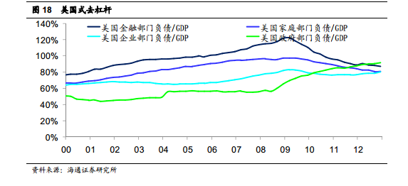 危机过后,去杠杆化是修复资产负债表的必然过程。参考美国的经验,我们发现,虽然去杠杆也经历阵痛,但杠杆并不是被消灭,而是被消化和转移,特别是通过三轮 QE,将杠杆转移到金融和政府部门。
