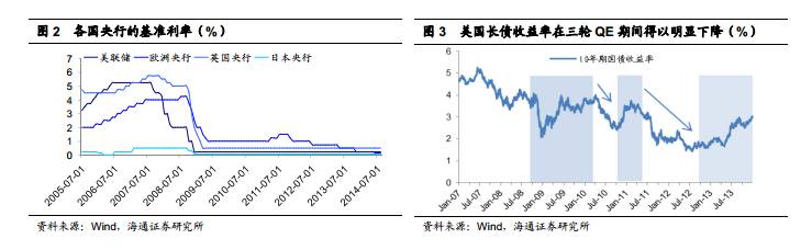 常规招式:降低基准利率,接近“零利率”。 次贷危机发生后,美国银行体系遭受重创,信贷活动萎缩,市场利率上升,实体经济难以得到资金支持。美联储首先采取的是基本招式——降低基准利率,接近“零利率”。 对于欧洲央行来说,更是降息无底线, 9 月再次将基准利率由 0.15%降至 0.05%,并继续调低隔夜存款利率至-0.20%。突破招式:量化宽松的货币政策。 随着各国利率基本下调至降无可降的底部,传统手段如公开市场操作,准备金率和贴现窗口等已近失效,量化宽松皆成为各国央行的突破招式。 2008 年 9 月起,美联储开始在公开市场上进行三轮大规模资产购买( QE),以压低实体经济长期融资成本,其资产负债表也伴随着每轮 QE 而扩张。欧元区金融机构主要通过欧洲央行设立的贷款便利机制拆入流动性,欧央行首先扩大了 LTRO (再融资操作)的规模,其金融部门杠杆的变化可以看成是主要再融资工具的发力所造成的。而日本央行则以购买国债成核心,资产负债表扩张仍将延续。